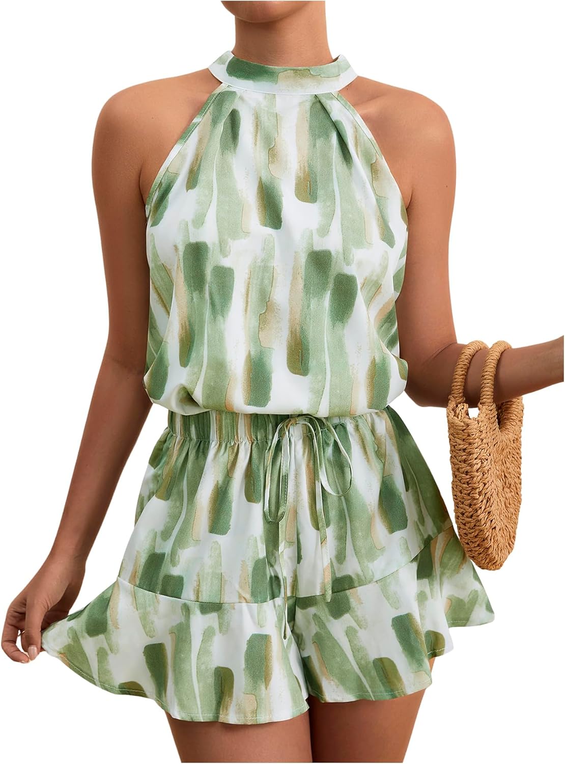 A 2-piece summer outfit with knot-back halter top and wide-leg shorts, perfect for casual and stylish warm-weather wear.