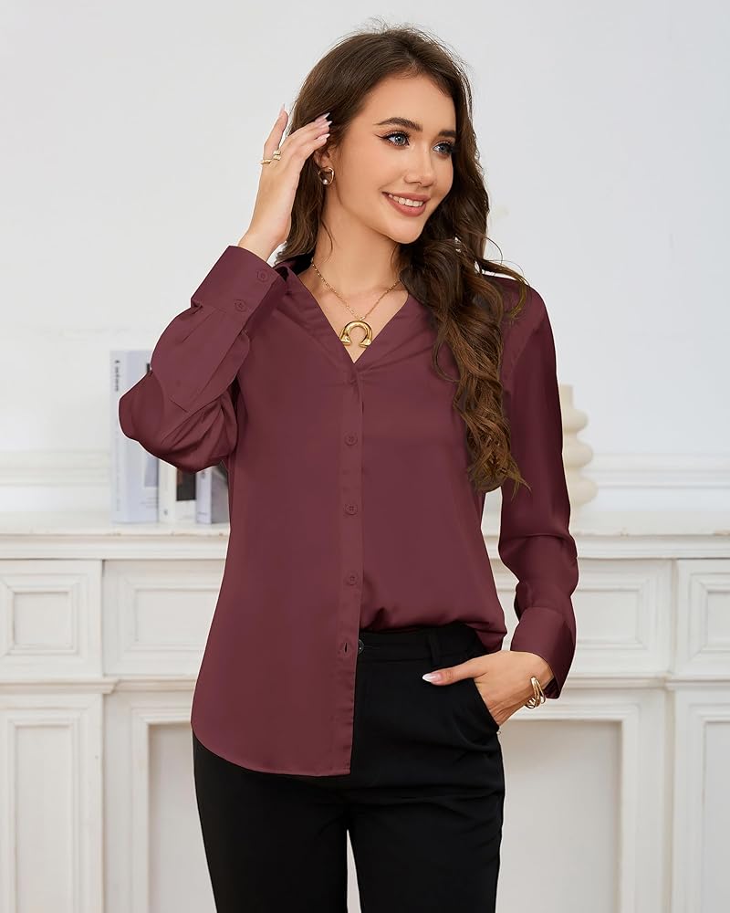 (50% off)A silk satin long-sleeve button-down shirt with point collar and V-neck, ideal for casual, formal, or workwear.